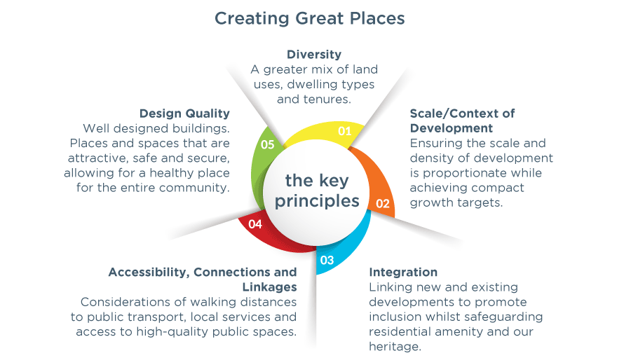 Key to providing great places will be striking a balance between the delivery of a compact pattern of development through increased density and high-quality design while protecting our built heritage. The successful delivery of such places will require a mix of uses, connections to sustainable transportation and infrastructure, a joined-up approach to community planning and a strategic vision which includes a greater emphasis on placemaking. Placemaking can create many different forms of public space whether these are hard surface, green etc., yet the overall picture is that these spaces can only be viewed as positive in everyday life. Our built heritage enhances our sense of place and history. Protected structures and architectural conservation areas will be reviewed as part of the Development Plan process.