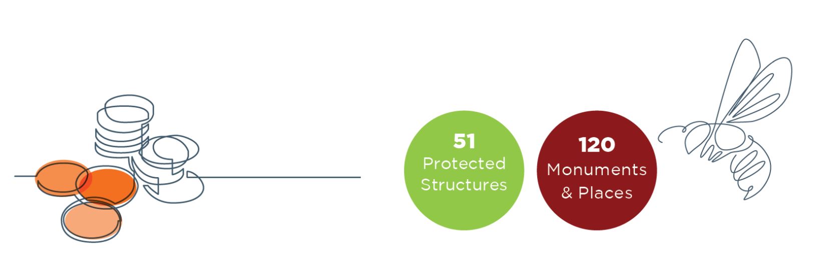 The rural uplands area provides a rich and diverse architectural and historic environment, comprising of a number of protected structures and identified national monuments/places. Within the rural uplands there are a number of farmhouses, demesne, agricultural buildings and vernacular structures which provide varied building styles and richness to the architectural quality of the area.
