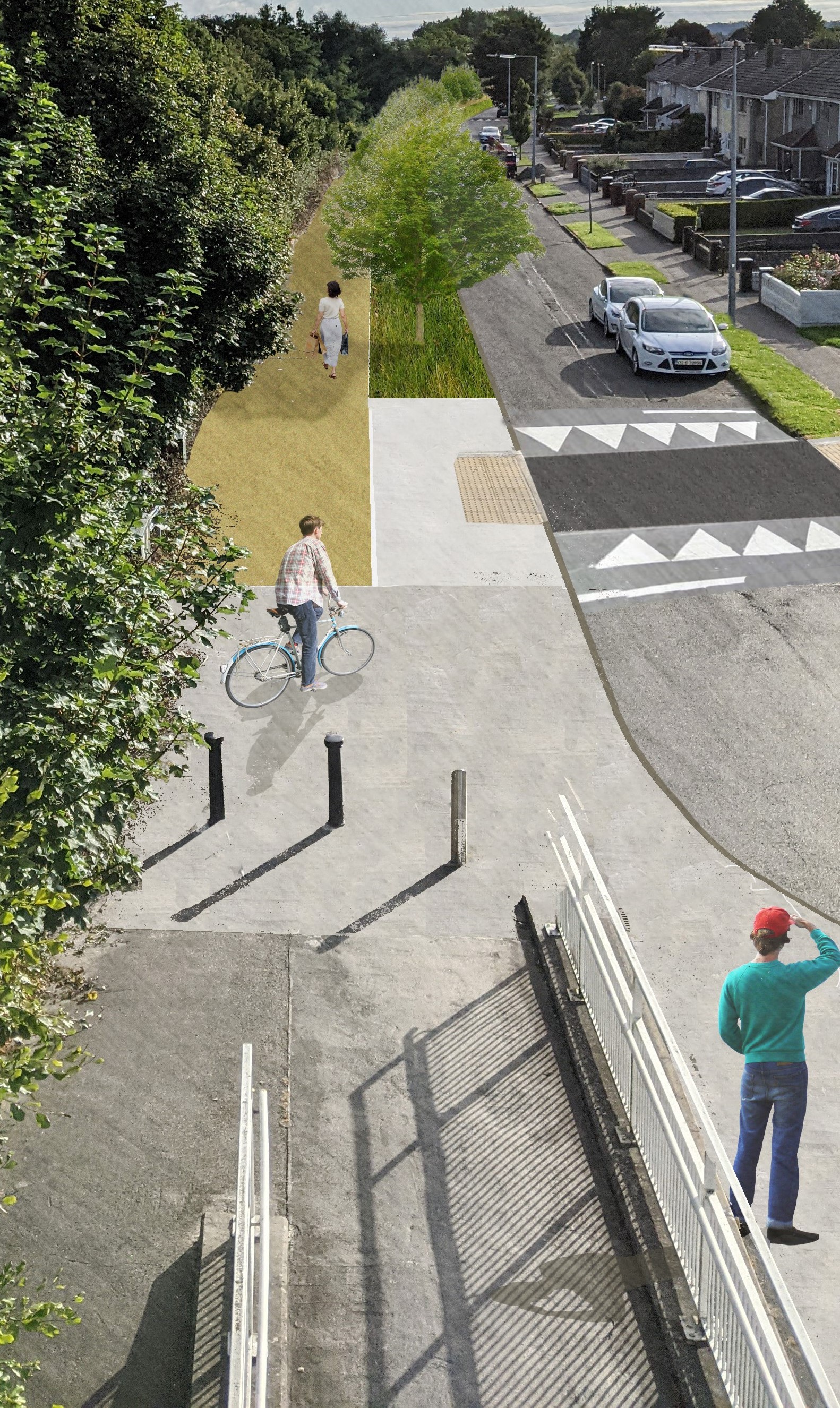 The existing 2m wide footpath on the north side of the road will be upgraded to a 4m wide shared pedestrian and cycle space. This will link up with the N81 crossing at Glenview, the Dodder Greenway link and provide improved access to the retail units at St. Dominic’s Shopping Centre. This will include new and safer crossings along the route.