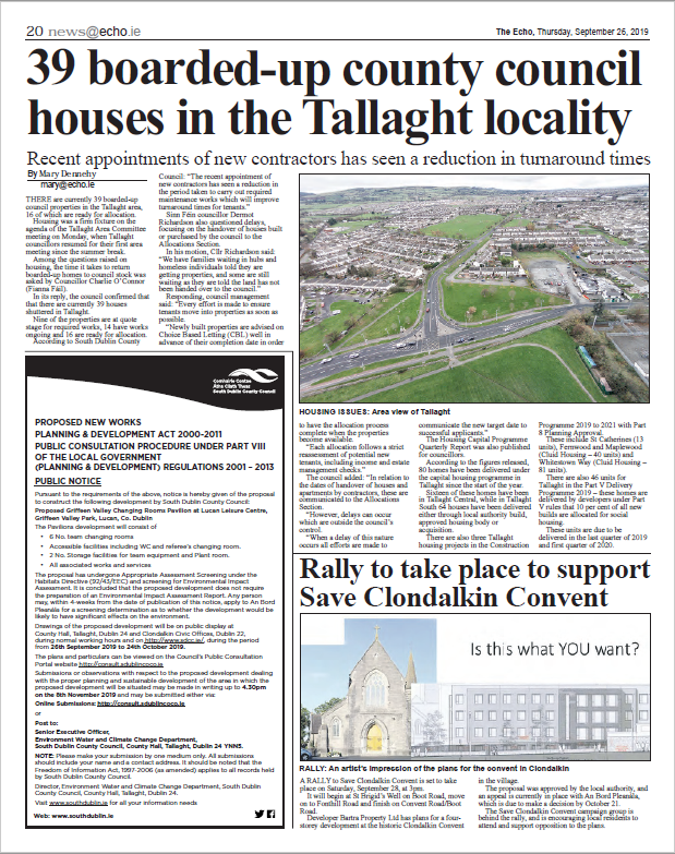 Drawings of the proposed development will be on public display at County Hall, Tallaght, Dublin 24 and Clondalkin Civic Offices, Dublin 22, during normal working hours and on http://www.sdcc.ie/, during the period from 26th September 2019 to 24th October 2019.